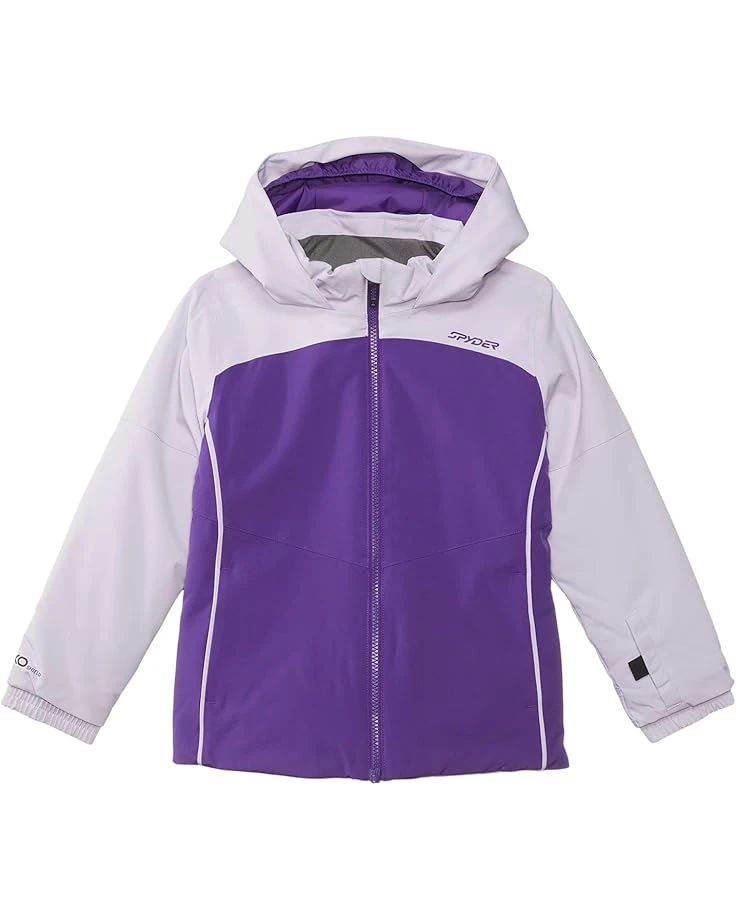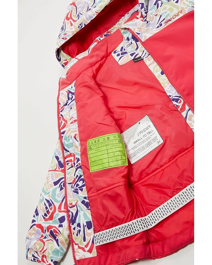- Featuring bold colors and stylish details, the Spyder® Kids Conquer Jacket makes every outdoor day more fun and safe. This standard length jacket features EXO THERMO Insulation, fixed helmet compatible hood with inner hood gaiter, YKK zippered hand pockets, fixed powder skirt with gripper elastic. long sleeves, zippered front closure, and brand name on the left chest. It has a data card, internal and mesh goggle pocket, elasticized cuffs with glove/mitten attachment, and a small to tall feature allows sleeves to extend an additional when stitch is released.