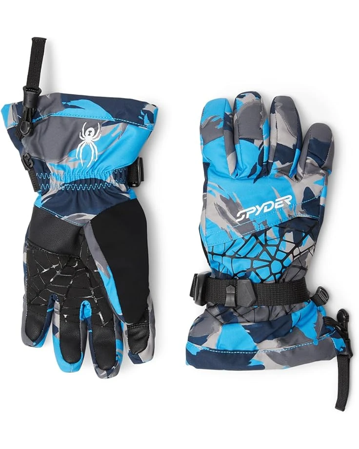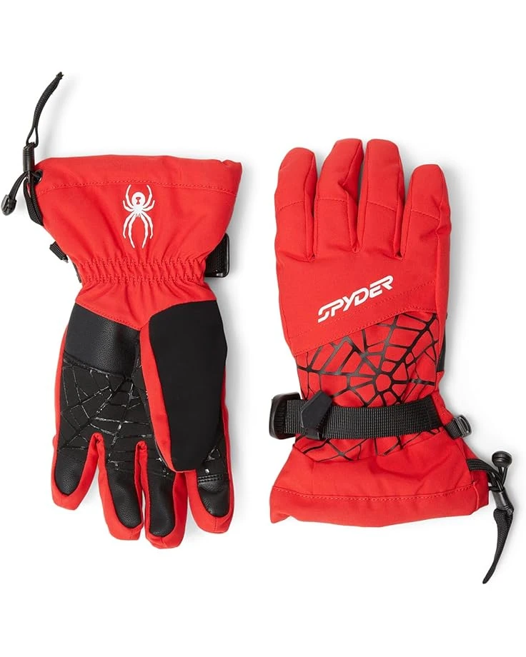 - Designed with PrimaLoft Silver ECO insulation, the Spyder® Kids Overweb Gloves are the perfect hand protection gear to keep your kid’s hands warm and cold-protected. These gloves are made from polyester fabric and an EXO SHIELD waterproof/breathable insert that keeps your kid’s hands dry. The adjustable wrist strap, an over-the-cuff gauntlet with an adjustable single-handed drawcord, PU flock nose-wipe on the back of the thumb, and removable wrist leash add to its functionality. With a conductive material for touchscreen devices, these insulated gloves are ideal for your kid’s cold-weather adventures.